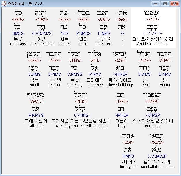 히브리어구약BHS,22 וְשָׁפְטוּ אֶת־הָעָם בְּכָל־עֵת וְהָיָה כָּל־הַדָּבָר הַגָּדֹל יָבִיאוּ אֵלֶיךָ וְכָל־הַדָּבָר הַקָּטֹן יִשְׁפְּטוּ־הֵם וְהָקֵל מֵעָלֶיךָ וְנָשְׂאוּ אִתָּךְ׃