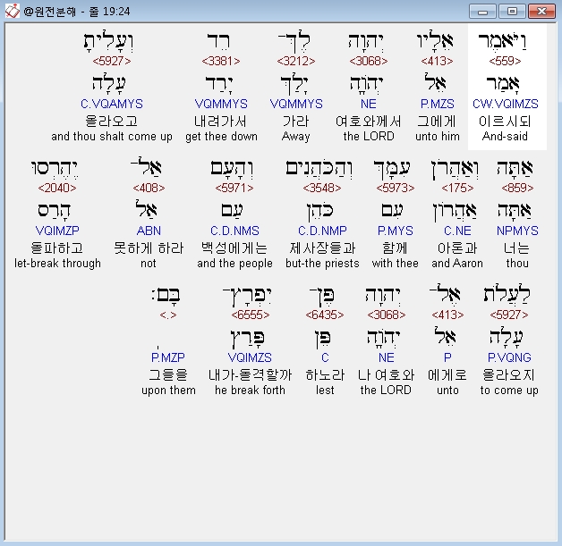 히브리어구약BHS,24 וַיֹּאמֶר אֵלָיו יְהוָה לֶךְ־רֵד וְעָלִיתָ אַתָּה וְאַהֲרֹן עִמָּךְ וְהַכֹּהֲנִים וְהָעָם אַל־יֶהֶרְסוּ לַעֲלֹת אֶל־יְהוָה פֶּן־יִפְרָץ־בָּם׃
