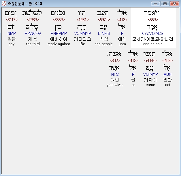 히브리어구약BHS,21 וַיֹּאמֶר יְהוָה אֶל־מֹשֶׁה רֵד הָעֵד בָּעָם פֶּן־יֶהֶרְסוּ אֶל־יְהוָה לִרְאֹות וְנָפַל מִמֶּנּוּ רָב׃