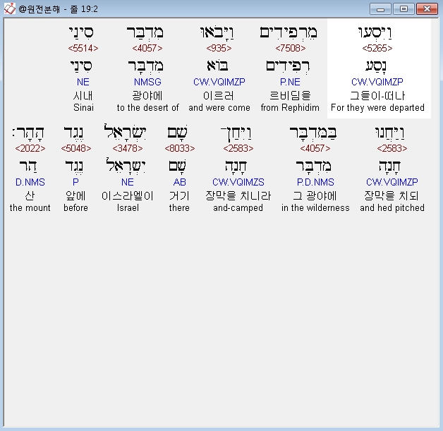히브리어구약BHS,2 וַיִּסְעוּ מֵרְפִידִים וַיָּבֹאוּ מִדְבַּר סִינַי וַיַּחֲנוּ בַּמִּדְבָּר וַיִּחַן־שָׁם יִשְׂרָאֵל נֶגֶד הָהָר׃
