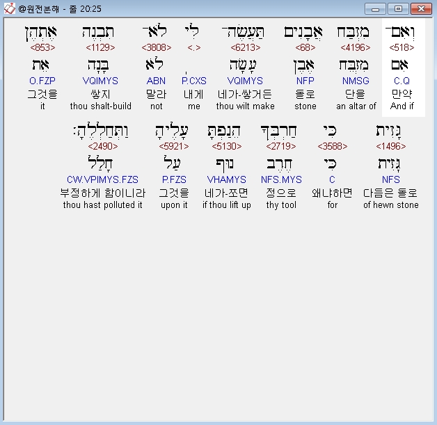 히브리어구약BHS,25 וְאִם־מִזְבַּח אֲבָנִים תַּעֲשֶׂה־לִּי לֹא־תִבְנֶה אֶתְהֶן גָּזִית כִּי חַרְבְּךָ הֵנַפְתָּ עָלֶיהָ וַתְּחַלְלֶהָ׃