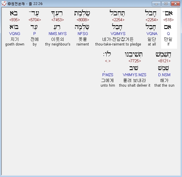히브리어구약BHS,26 אִם־חָבֹל תַּחְבֹּל שַׂלְמַת רֵעֶךָ עַד־בֹּא הַשֶּׁמֶשׁ תְּשִׁיבֶנּוּ לֹו׃