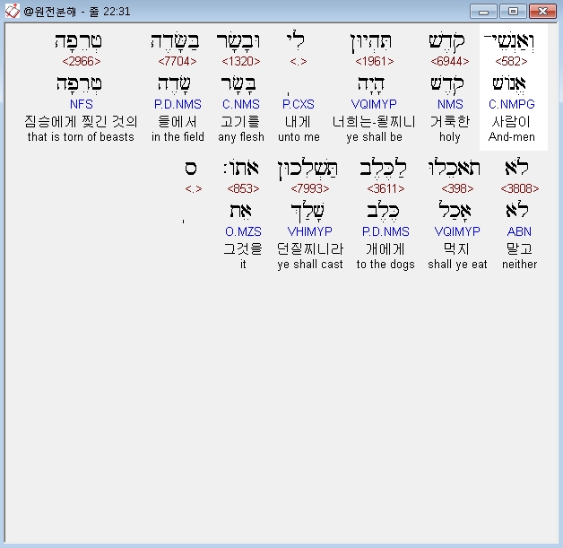히브리어구약BHS,31 וְאַנְשֵׁי־קֹדֶשׁ תִּהְיוּן לִי וּבָשָׂר בַּשָּׂדֶה טְרֵפָה לֹא תֹאכֵלוּ לַכֶּלֶב תַּשְׁלִכוּן אֹתֹו׃ ס