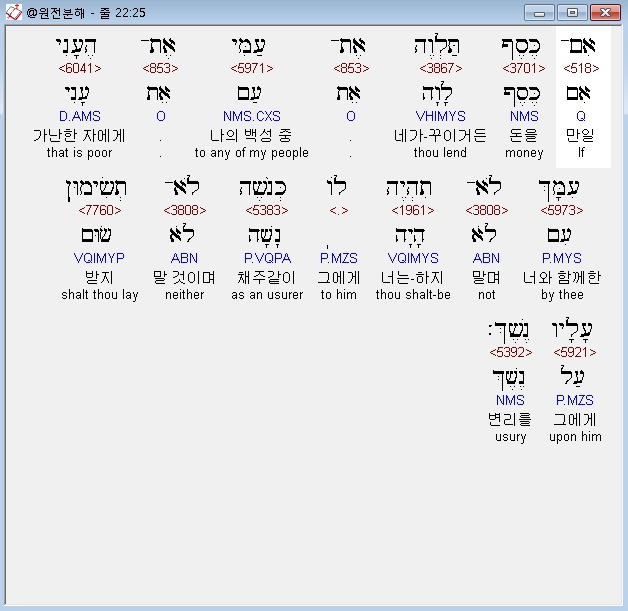 히브리어구약BHS,25 אִם־כֶּסֶף תַּלְוֶה אֶת־עַמִּי אֶת־הֶעָנִי עִמָּךְ לֹא־תִהְיֶה לֹו כְּנֹשֶׁה לֹא־תְשִׂימוּן עָלָיו נֶשֶׁךְ׃