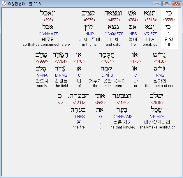 히브리어구약BHS,6 כִּי־תֵצֵא אֵשׁ וּמָצְאָה קֹצִים וְנֶאֱכַל גָּדִישׁ אֹו הַקָּמָה אֹו הַשָּׂדֶה שַׁלֵּם יְשַׁלֵּם הַמַּבְעִר אֶת־הַבְּעֵרָה׃ ס