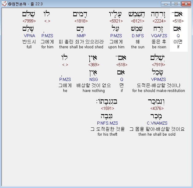 히브리어구약BHS,3 אִם־זָרְחָה הַשֶּׁמֶשׁ עָלָיו דָּמִים לֹו שַׁלֵּם יְשַׁלֵּם אִם־אֵין לֹו וְנִמְכַּר בִּגְנֵבָתֹו׃