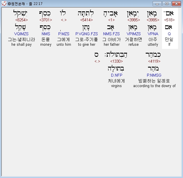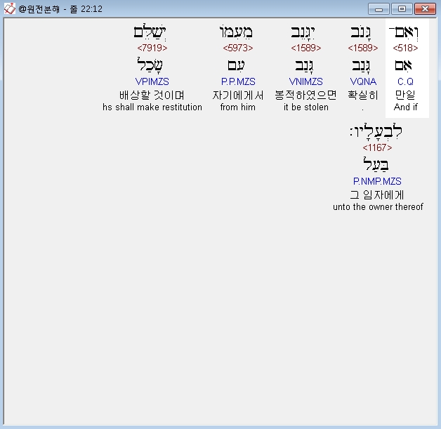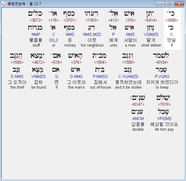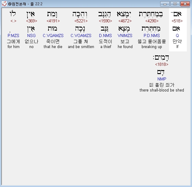 히브리어구약BHS,2 אִם־בַּמַּחְתֶּרֶת יִמָּצֵא הַגַּנָּב וְהֻכָּה וָמֵת אֵין לֹו דָּמִים׃