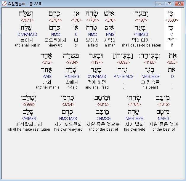 히브리어구약BHS,5 כִּי יַבְעֶר־אִישׁ שָׂדֶה אֹו־כֶרֶם וְשִׁלַּח אֶת־[כ= בְּעִירָה] [ק= בְּעִירֹו] וּבִעֵר בִּשְׂדֵה אַחֵר מֵיטַב שָׂדֵהוּ וּמֵיטַב כַּרְמֹו יְשַׁלֵּם׃ ס