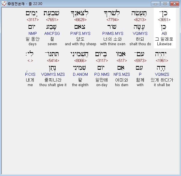 히브리어구약BHS,30 כֵּן־תַּעֲשֶׂה לְשֹׁרְךָ לְצֹאנֶךָ שִׁבְעַת יָמִים יִהְיֶה עִם־אִמֹּו בַּיֹּום הַשְּׁמִינִי תִּתְּנֹו־לִי׃