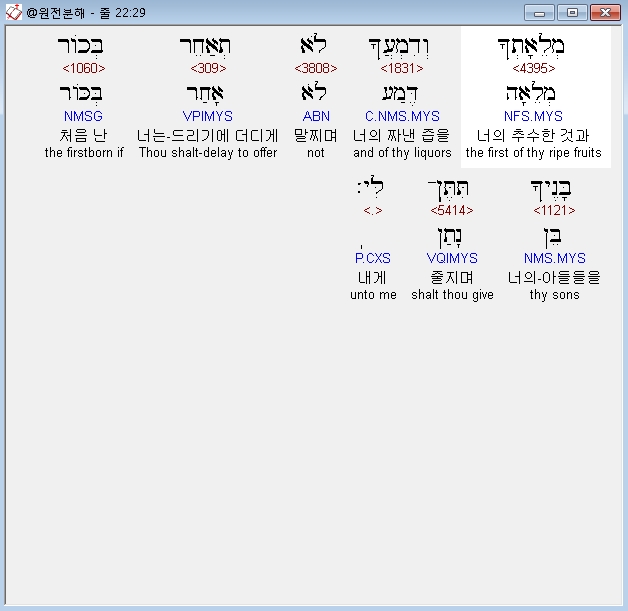 히브리어구약BHS,29 מְלֵאָתְךָ וְדִמְעֲךָ לֹא תְאַחֵר בְּכֹור בָּנֶיךָ תִּתֶּן־לִּי׃*