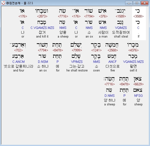 히브리어구약BHS,1 כִּי יִגְנֹב־אִישׁ שֹׁור אֹו־שֶׂה וּטְבָחֹו אֹו מְכָרֹו חֲמִשָּׁה בָקָר יְשַׁלֵּם תַּחַת הַשֹּׁור וְאַרְבַּע־צֹאן תַּחַת הַשֶּׂה׃