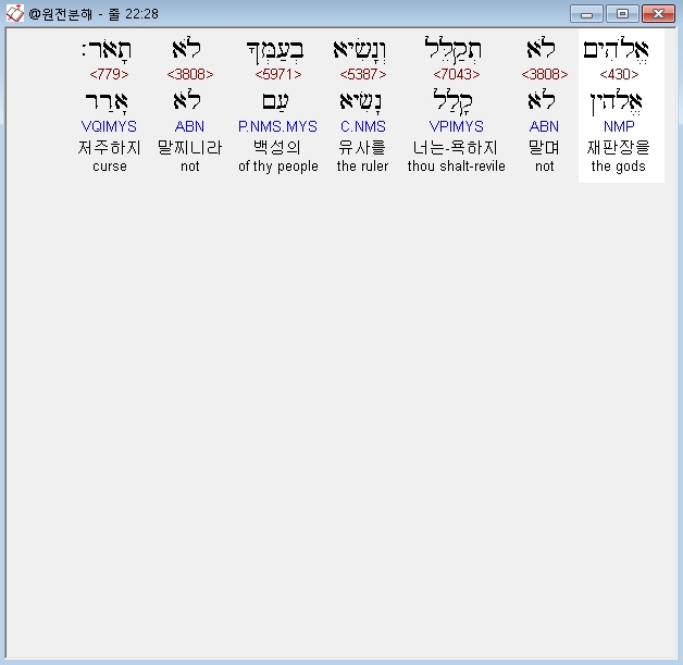 히브리어구약BHS,28 אֱלֹהִים לֹא תְקַלֵּל וְנָשִׂיא בְעַמְּךָ לֹא תָאֹר׃