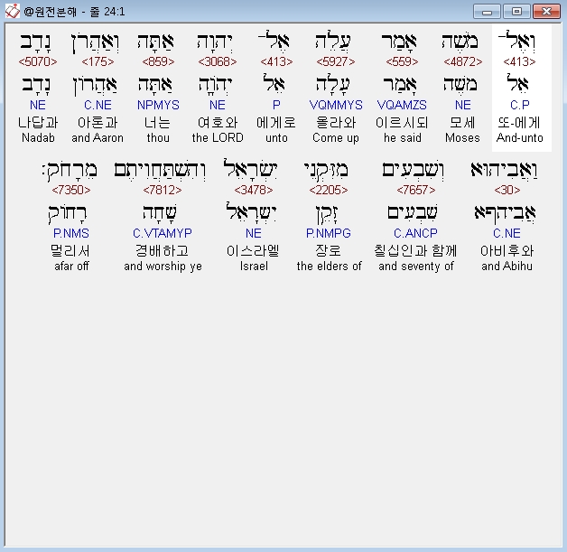 히브리어구약BHS,1 וְאֶל־מֹשֶׁה אָמַר עֲלֵה אֶל־יְהוָה אַתָּה וְאַהֲרֹן נָדָב וַאֲבִיהוּא וְשִׁבְעִים מִזִּקְנֵי יִשְׂרָאֵל וְהִשְׁתַּחֲוִיתֶם מֵרָחֹק׃