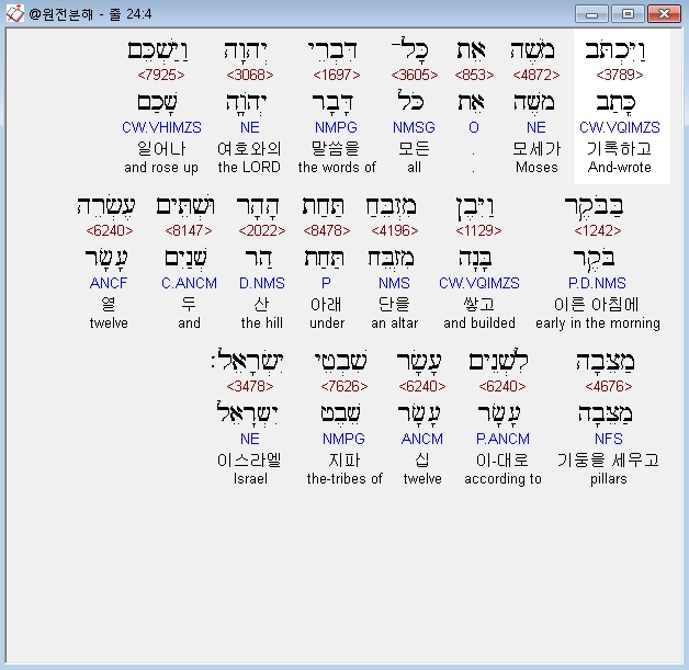히브리어구약BHS,4 וַיִּכְתֹּב מֹשֶׁה אֵת כָּל־דִּבְרֵי יְהוָה וַיַּשְׁכֵּם בַּבֹּקֶר וַיִּבֶן מִזְבֵּחַ תַּחַת הָהָר וּשְׁתֵּים עֶשְׂרֵה מַצֵּבָה לִשְׁנֵים עָשָׂר שִׁבְטֵי יִשְׂרָאֵל׃