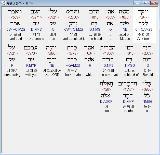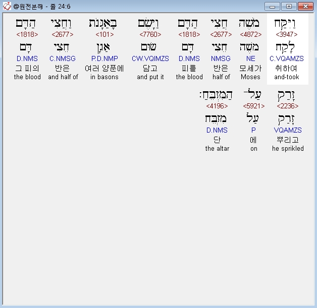 히브리어구약BHS,6 וַיִּקַּח מֹשֶׁה חֲצִי הַדָּם וַיָּשֶׂם בָּאַגָּנֹת וַחֲצִי הַדָּם זָרַק עַל־הַמִּזְבֵּחַ׃