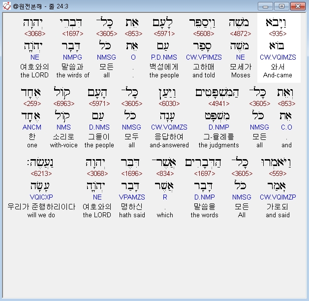 히브리어구약BHS,3 וַיָּבֹא מֹשֶׁה וַיְסַפֵּר לָעָם אֵת כָּל־דִּבְרֵי יְהוָה וְאֵת כָּל־הַמִּשְׁפָּטִים וַיַּעַן כָּל־הָעָם קֹול אֶחָד וַיֹּאמְרוּ כָּל־הַדְּבָרִים אֲשֶׁר־דִּבֶּר יְהוָה נַעֲשֶׂה׃