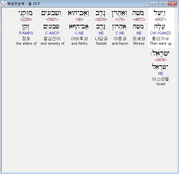 헬라어구약Septuagint,1 και μωυση ειπεν αναβηθι προς κυριον συ και ααρων και ναδαβ και αβιουδ και εβδομηκοντα των πρεσβυτερων ισραηλ και προσκυνησουσιν μακροθεν τω κυριω