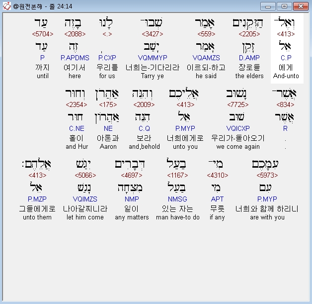 히브리어구약BHS,14 וְאֶל־הַזְּקֵנִים אָמַר שְׁבוּ־לָנוּ בָזֶה עַד אֲשֶׁר־נָשׁוּב אֲלֵיכֶם וְהִנֵּה אַהֲרֹן וְחוּר עִםָּכֶם מִי־בַעַל דְּבָרִים יִגַּשׁ אֲלֵהֶם׃