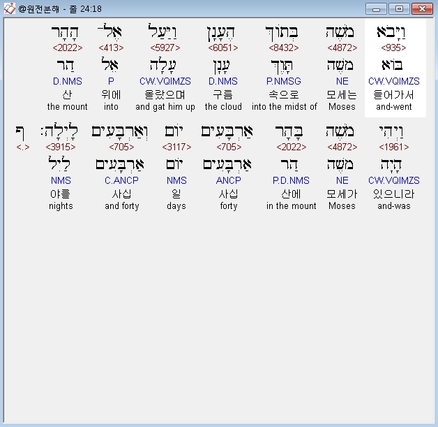 히브리어구약BHS,18 וַיָּבֹא מֹשֶׁה בְּתֹוךְ הֶעָןָן וַיַּעַל אֶל־הָהָר וַיְהִי מֹשֶׁה בָּהָר אַרְבָּעִים יֹום וְאַרְבָּעִים לָיְלָה׃ ף