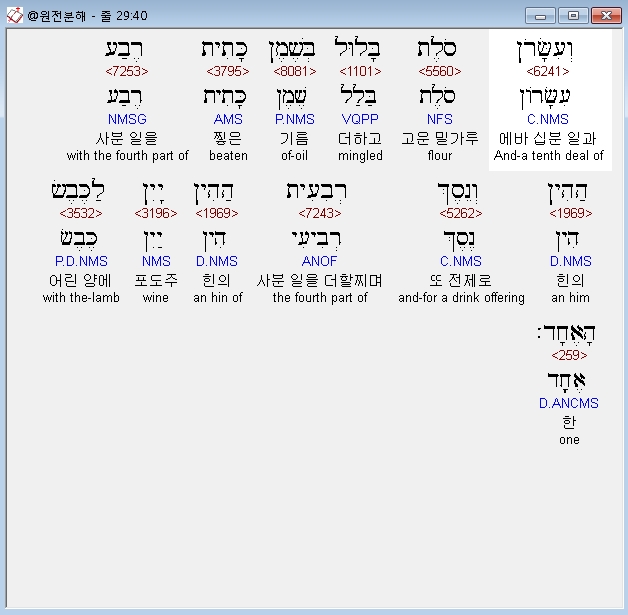히브리어구약BHS,40 וְעִשָּׂרֹן סֹלֶת בָּלוּל בְּשֶׁמֶן כָּתִית רֶבַע הַהִין וְנֵסֶךְ רְבִעִית הַהִין יָיִן לַכֶּבֶשׂ הָאֶחָד׃