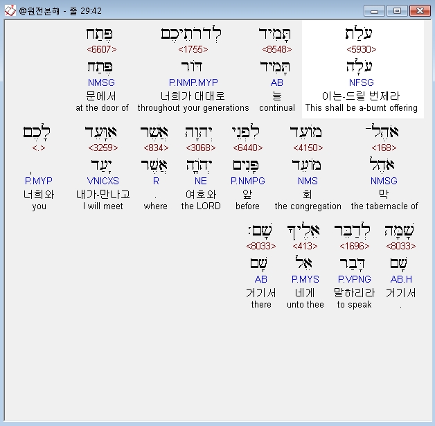 헬라어구약Septuagint,42 θυσιαν ενδελεχισμου εις γενεας υμων επι θυρας της σκηνης του μαρτυριου εναντι κυριου εν οις γνωσθησομαι σοι εκειθεν ωστε λαλησαι σοι