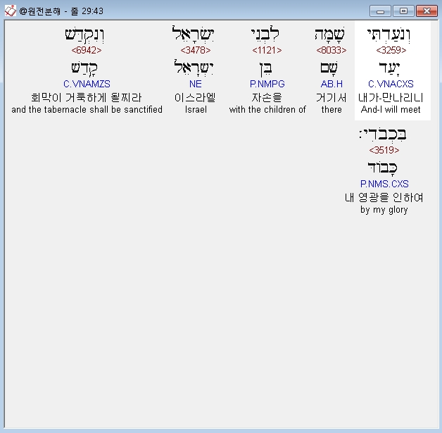 히브리어구약BHS,43 וְנֹעַדְתִּי שָׁמָּה לִבְנֵי יִשְׂרָאֵל וְנִקְדַּשׁ בִּכְבֹדִי׃