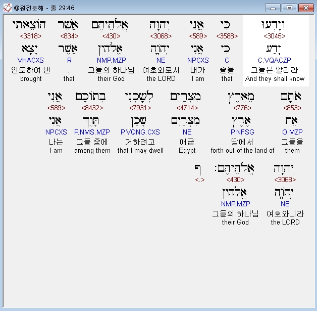 히브리어구약BHS,46 וְיָדְעוּ כִּי אֲנִי יְהוָה אֱלֹהֵיהֶם אֲשֶׁר הֹוצֵאתִי אֹתָם מֵאֶרֶץ מִצְרַיִם לְשָׁכְנִי בְתֹוכָם אֲנִי יְהוָה אֱלֹהֵיהֶם׃ ף