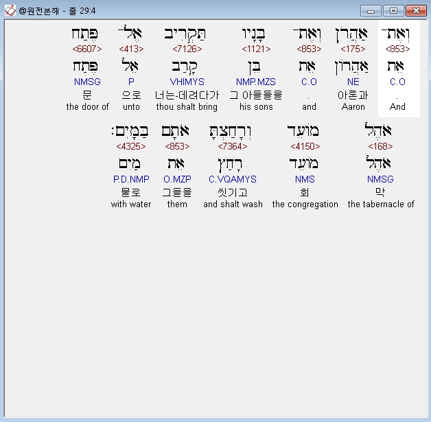 히브리어구약BHS,4 וְאֶת־אַהֲרֹן וְאֶת־בָּנָיו תַּקְרִיב אֶל־פֶּתַח אֹהֶל מֹועֵד וְרָחַצְתָּ אֹתָם בַּמָּיִם׃