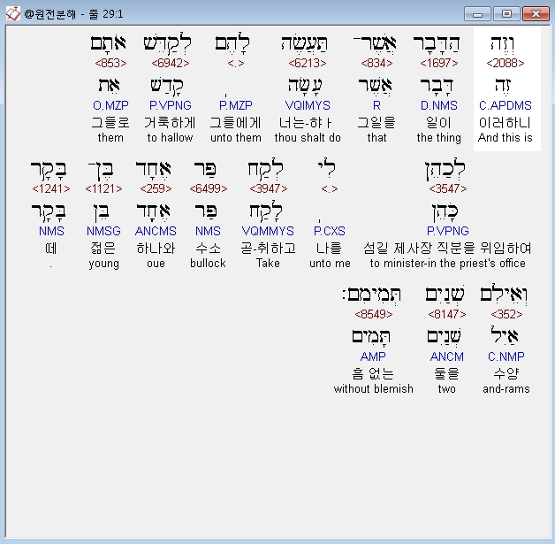 히브리어구약BHS,1 וְזֶה* הַדָּבָר אֲשֶׁר־תַּעֲשֶׂה לָהֶם לְקַדֵּשׁ אֹתָם לְכַהֵן לִי לְקַח פַּר אֶחָד בֶּן־בָּקָר וְאֵילִם שְׁנַיִם תְּמִיםִם׃