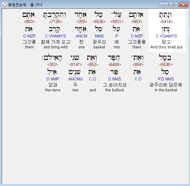 히브리어구약BHS,3 וְנָתַתָּ אֹותָם עַל־סַל אֶחָד וְהִקְרַבְתָּ אֹתָם בַּסָּל וְאֶת־הַפָּר וְאֵת שְׁנֵי הָאֵילִם׃