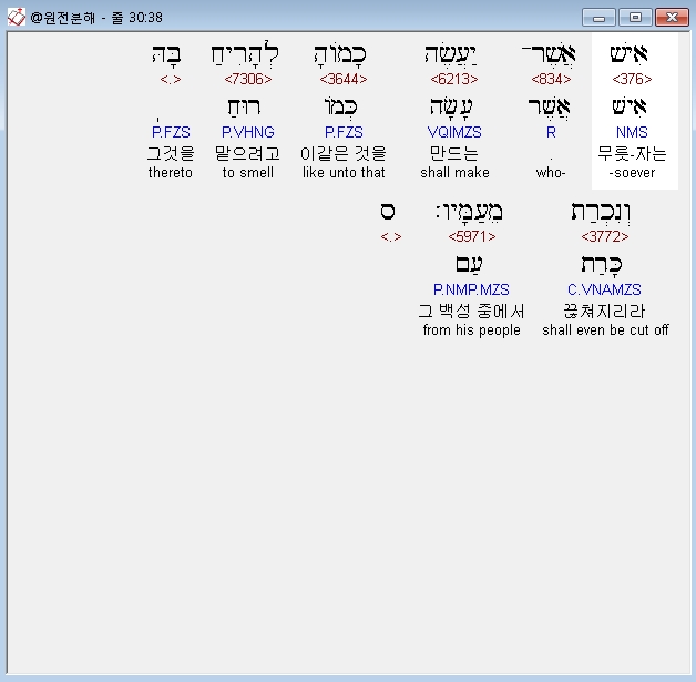 히브리어구약BHS,38 אִישׁ אֲשֶׁר־יַעֲשֶׂה כָמֹוהָ לְהָרִיחַ בָּהּ וְנִכְרַת מֵעַמָּיו׃ ס