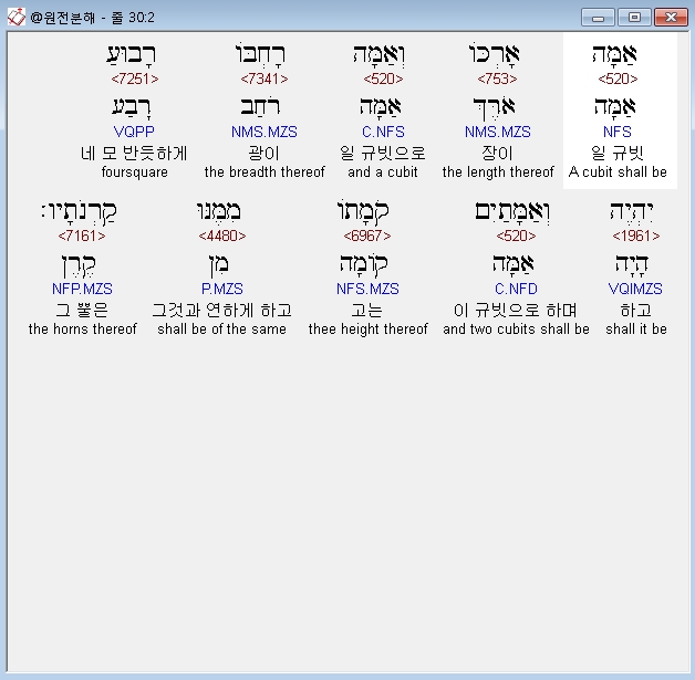 히브리어구약BHS,2 אַמָּה אָרְכֹּו וְאַמָּה רָחְבֹּו רָבוּעַ יִהְיֶה וְאַמָּתַיִם קֹמָתֹו מִמֶּנּוּ קַרְנֹתָיו׃