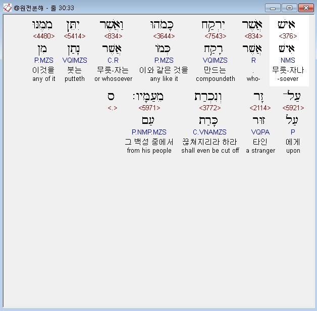 히브리어구약BHS,33 אִישׁ אֲשֶׁר יִרְקַח כָּמֹהוּ וַאֲשֶׁר יִתֵּן מִמֶּנּוּ עַל־זָר וְנִכְרַת מֵעַמָּיו׃ ס