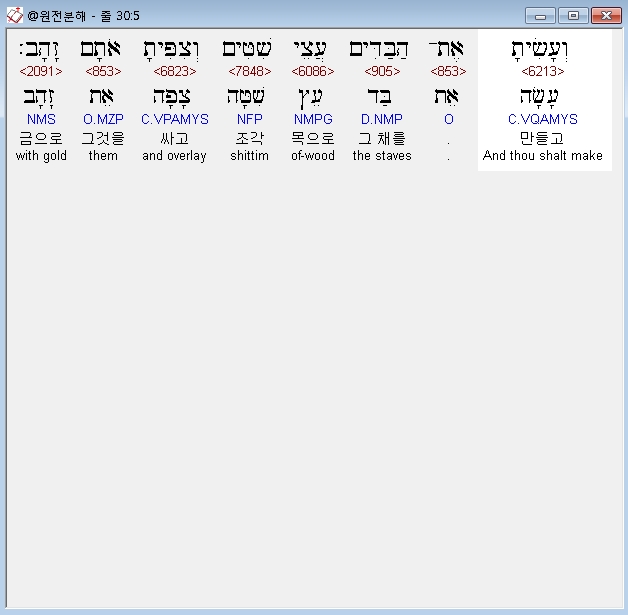 히브리어구약BHS,5 וְעָשִׂיתָ אֶת־הַבַּדִּים עֲצֵי שִׁטִּים וְצִפִּיתָ אֹתָם זָהָב׃