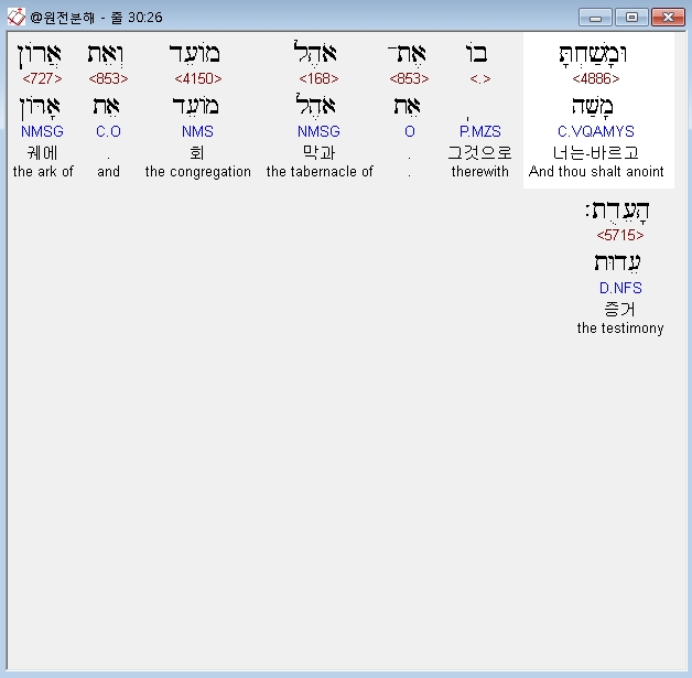 영어MSG,36 Now crush some of it into powder and place some of it before The Testimony in the Tent of Meeting where I will meet with you; it will be for you the holiest of holy places.