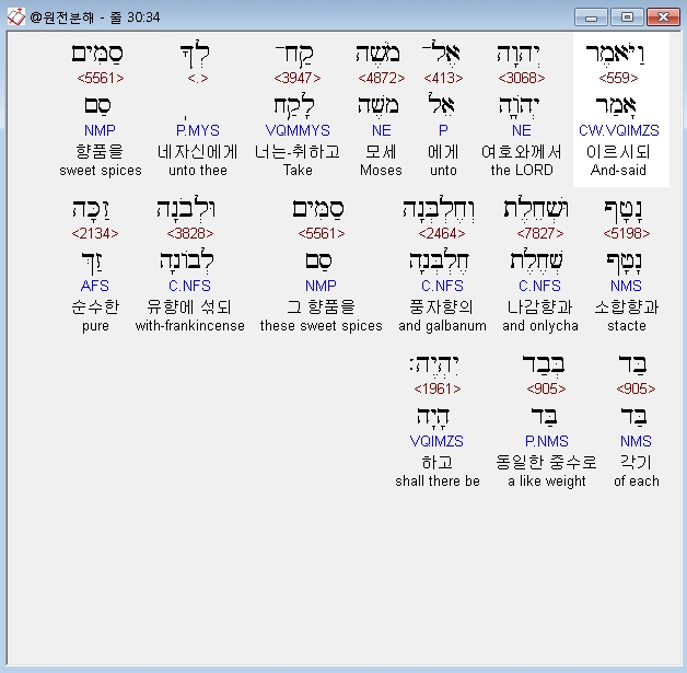 히브리어구약BHS,34 וַיֹּאמֶר יְהוָה אֶל־מֹשֶׁה קַח־לְךָ סַמִּים נָטָף וּשְׁחֵלֶת וְחֶלְבְּנָה סַמִּים וּלְבֹנָה זַכָּה בַּד בְּבַד יִהְיֶה׃