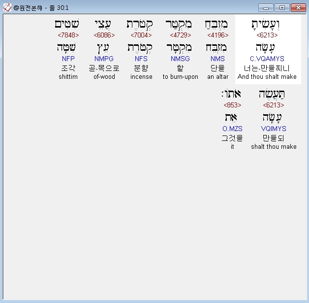 히브리어구약BHS,1 וְעָשִׂיתָ מִזְבֵּחַ מִקְטַר קְטֹרֶת עֲצֵי שִׁטִּים תַּעֲשֶׂה אֹתֹו׃