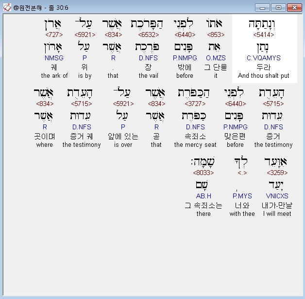 히브리어구약BHS,6 וְנָתַתָּה אֹתֹו לִפְנֵי הַפָּרֹכֶת אֲשֶׁר עַל־אֲרֹן הָעֵדֻת לִפְנֵי הַכַּפֹּרֶת אֲשֶׁר עַל־הָעֵדֻת אֲשֶׁר אִוָּעֵד לְךָ שָׁמָּה׃