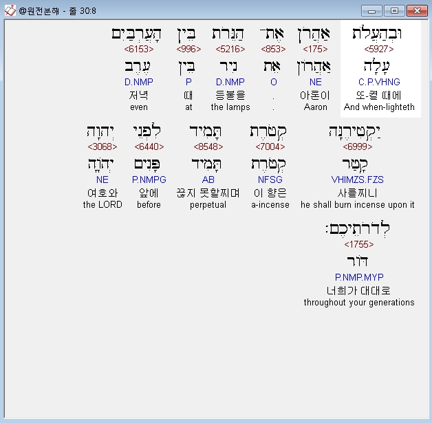 헬라어구약Septuagint,7 και θυμιασει επ' αυτου ααρων θυμιαμα συνθετον λεπτον το πρωι πρωι οταν επισκευαζη τους λυχνους θυμιασει επ' αυτου