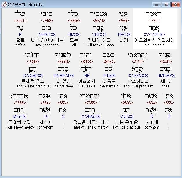 히브리어구약BHS,19 וַיֹּאמֶר אֲנִי אַעֲבִיר כָּל־טוּבִי עַל־פָּנֶיךָ וְקָרָאתִי בְשֵׁם יְהוָה לְפָנֶיךָ וְחַנֹּתִי אֶת־אֲשֶׁר אָחֹן וְרִחַמְתִּי אֶת־אֲשֶׁר אֲרַחֵם׃
