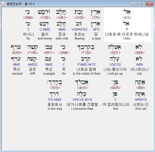 히브리어구약BHS,3 אֶל־אֶרֶץ זָבַת חָלָב וּדְבָשׁ כִּי לֹא אֶעֱלֶה בְּקִרְבְּךָ כִּי עַם־קְשֵׁה־עֹרֶף אַתָּה פֶּן־אֲכֶלְךָ בַּדָּרֶךְ׃