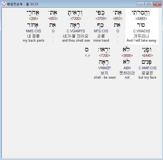 히브리어구약BHS,23 וַהֲסִרֹתִי אֶת־כַּפִּי וְרָאִיתָ אֶת־אֲחֹרָי וּפָנַי לֹא יֵרָאוּ׃ ס