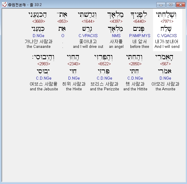 히브리어구약BHS,2 וְשָׁלַחְתִּי לְפָנֶיךָ מַלְאָךְ וְגֵרַשְׁתִּי אֶת־הַכְּנַעֲנִי הָאֱמֹרִי וְהַחִתִּי וְהַפְּרִזִּי הַחִוִּי וְהַיְבוּסִי׃