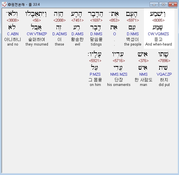 히브리어구약BHS,4 וַיִּשְׁמַע הָעָם אֶת־הַדָּבָר הָרָע הַזֶּה וַיִּתְאַבָּלוּ וְלֹא־שָׁתוּ אִישׁ עֶדְיֹו עָלָיו׃