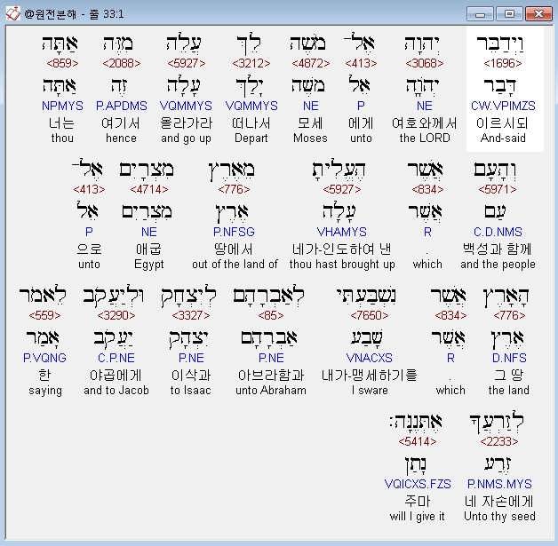 히브리어구약BHS,1 וַיְדַבֵּר יְהוָה אֶל־מֹשֶׁה לֵךְ עֲלֵה מִזֶּה אַתָּה וְהָעָם אֲשֶׁר הֶעֱלִיתָ מֵאֶרֶץ מִצְרָיִם אֶל־הָאָרֶץ אֲשֶׁר נִשְׁבַּעְתִּי לְאַבְרָהָם לְיִצְחָק וּלְיַעֲקֹב לֵאמֹר לְזַרְעֲךָ אֶתְּנֶנָּה׃