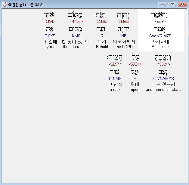 히브리어구약BHS,21 וַיֹּאמֶר יְהוָה הִנֵּה מָקֹום אִתִּי וְנִצַּבְתָּ עַל־הַצּוּר׃