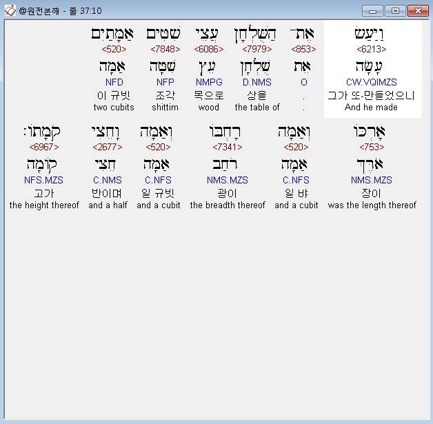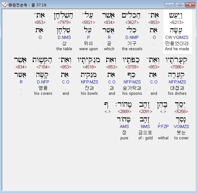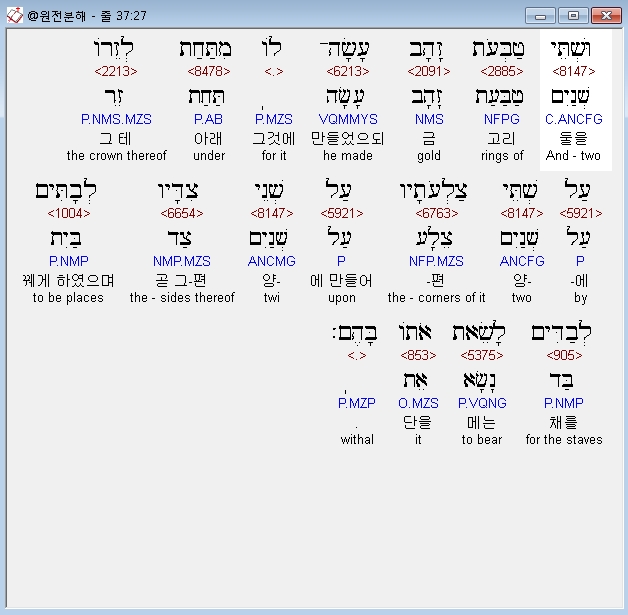 히브리어구약BHS,28 וַיַּעַשׂ אֶת־הַבַּדִּים עֲצֵי שִׁטִּים וַיְצַף אֹתָם זָהָב׃