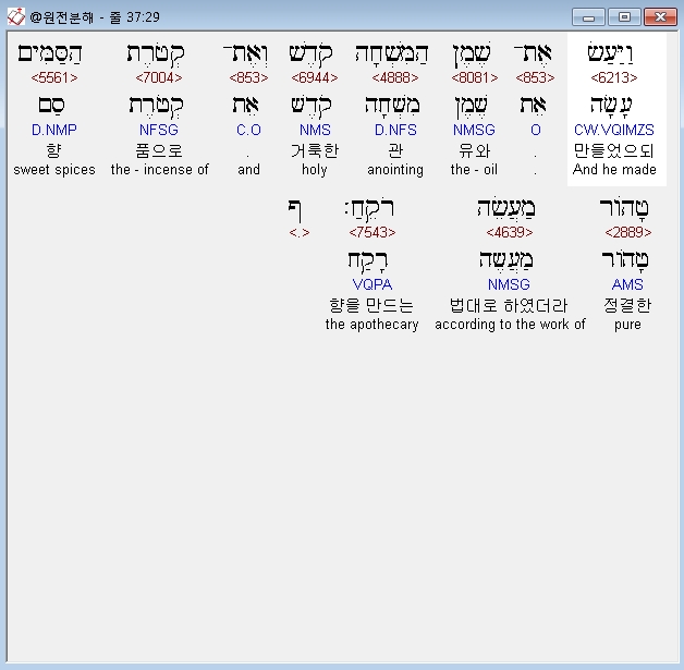 히브리어구약BHS,29 וַיַּעַשׂ אֶת־שֶׁמֶן הַמִּשְׁחָה קֹדֶשׁ וְאֶת־קְטֹרֶת הַסַּמִּים טָהֹור מַעֲשֵׂה רֹקֵחַ׃ ף