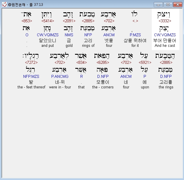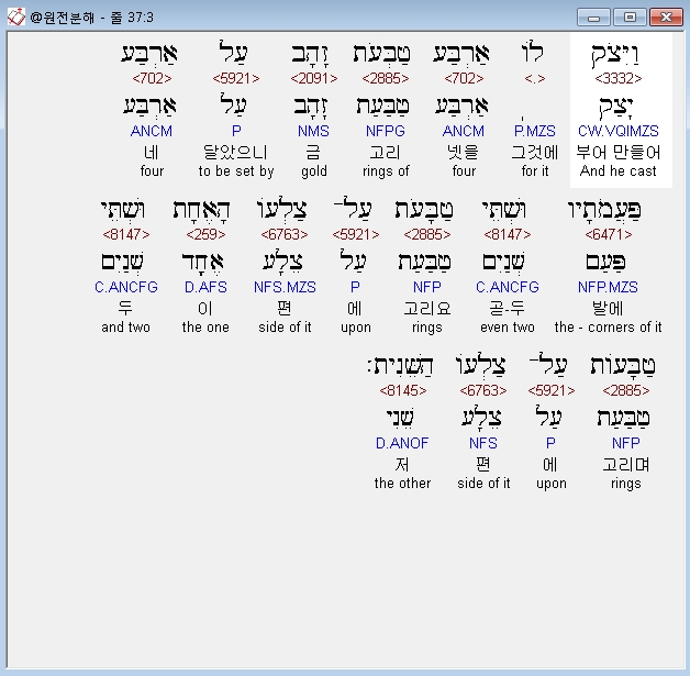 히브리어구약BHS,3 וַיִּצֹק לֹו אַרְבַּע טַבְּעֹת זָהָב עַל אַרְבַּע פַּעֲמֹתָיו וּשְׁתֵּי טַבָּעֹת עַל־צַלְעֹו הָאֶחָת וּשְׁתֵּי טַבָּעֹות עַל־צַלְעֹו הַשֵּׁנִית׃