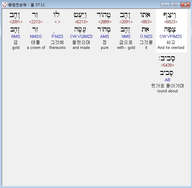 히브리어구약BHS,2 וַיְצַפֵּהוּ זָהָב טָהֹור מִבַּיִת וּמִחוּץ וַיַּעַשׂ לֹו זֵר זָהָב סָבִיב׃